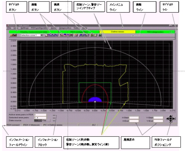 Leuze社RS-4レーザースキャナー(エリアスキャン)は190°のエリアを角度分解能0.36°で25scan/secという高速でスキャンニングします。動作範囲で検出された物体の位置座標を精密に検出できます。保護領域(4つの異なった領域)の設定は付属のソフトウエアーより行うことが出来ます。