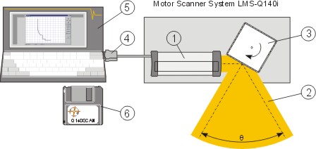 | 距離測定ユニット(1)は、Riegl社のレーザー距離測定器「LD90-3」を基礎にして設計されていますが、高速スキャンニング(高いレーザー繰り返し周波数、高速信号処理 及び高速データインターフェース)の要求を満たせる様に最適化されています。 レーザービーム(2)のスキャンニングは、回転ポリゴンミラー(3)で行います。 調整可能な速度で連続回転するポリゴンミラーによって、【60 。】或は【80 。】の角度範囲を一定方向にスキャンニングできます。 得られた「距離」「信号強度」「角度」及び「時間」の情報は、イーサーネットで出力され、PC(5)やラップトップのECP仕様のLPTプリンターポート(4)に直接接続されます。 「LMS-Q240」は同期の目的でGPSのクロックパルスを受け入れる事も可能です。 PCにはソフトウエアー「Q240SCAN(6)」をインストールします。 このプログラムはWindowsXP、NT4.0、2000、及び95/98で作動し、データの収集及びリアルタイム表示を行います。 表示された歪みのない画像を拡大したり、移動させたり、クリップボードにコピーする事ができます。 データの後処理の為には、スキャナーのデータをデイスクに保存する事が可能です。 |